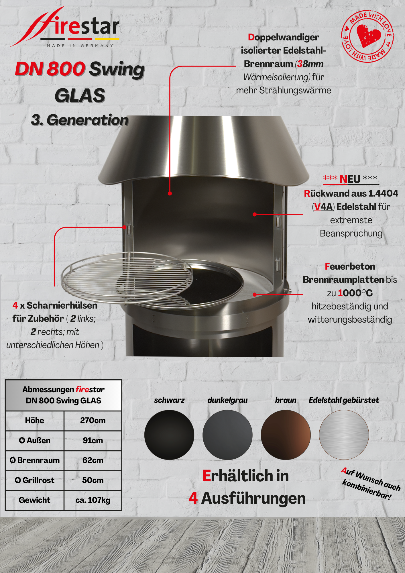 Grillkamin Firestar DN 800 Swing GLAS 3. Generation inkl. Grillrost und Fettschutzpfanne